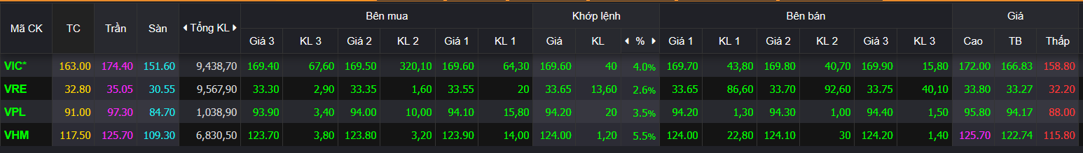 Thậm chí, thời điểm hơn 14h, VHM tăng rất mạnh (+6,04%), VIC (+4,05%), VPL (+3,85%), với tổng mức đóng góp tới hơn 18 điểm vào chỉ số.