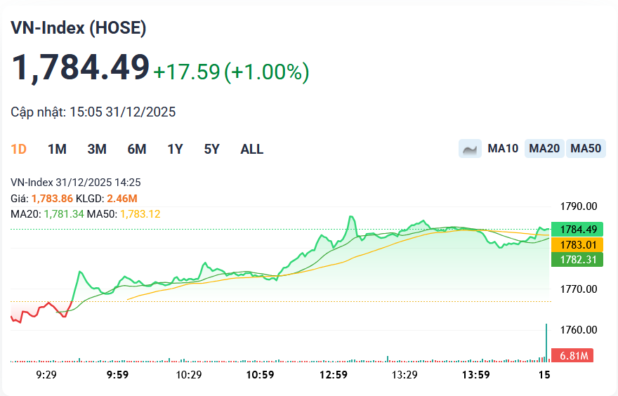 Chỉ trong thời gian ngắn, các mốc điểm từ 1,400, 1,500, 1,600 và 1,700 đã lần lượt bị xuyên phá, để rồi kết phiên giao dịch cuối năm tại 1,784.49, lập đỉnh mọi thời đại.