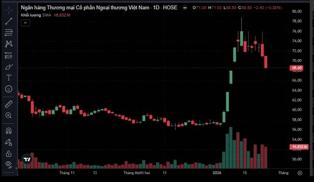 Theo dữ liệu giao dịch, phiên 23/1 ghi nhận khối lượng trên 16,8 triệu cổ phiếu VCB được trao tay - tương đương giá trị giao dịch đạt hơn 1.166 tỷ đồng.