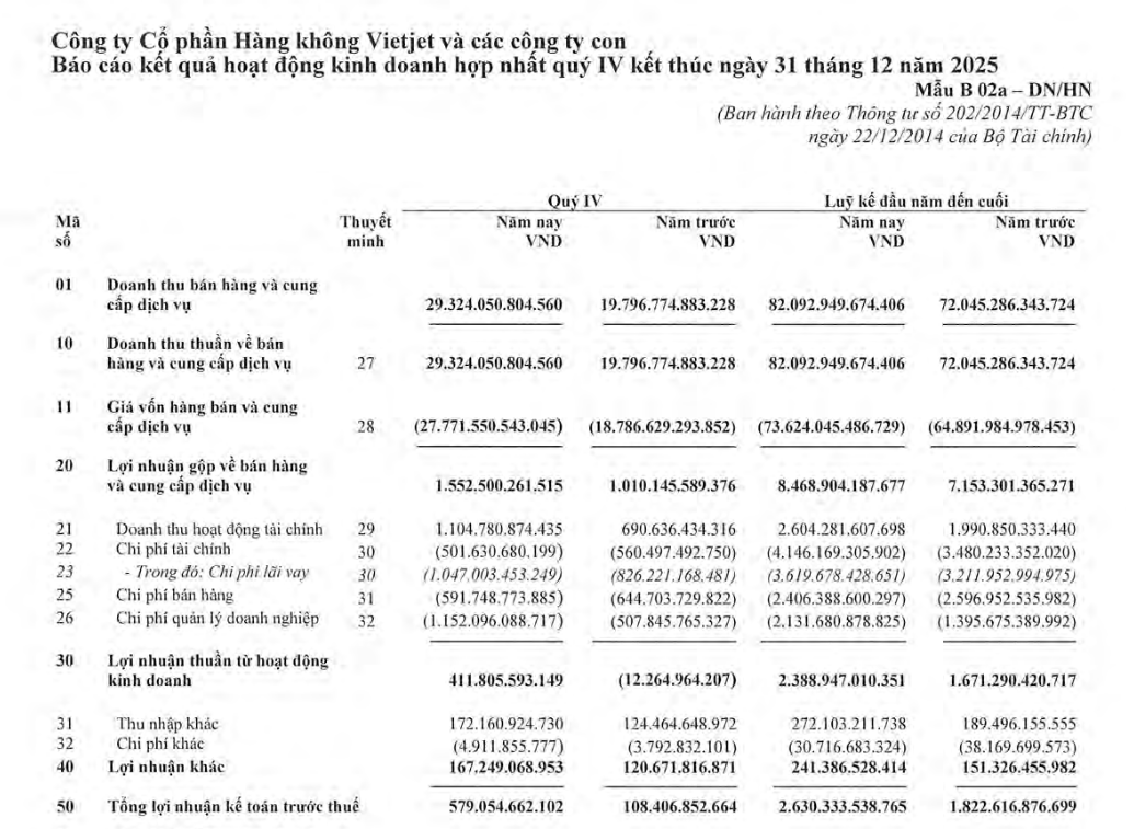 Theo lý giải của Vietjet, lợi nhuận gộp của công ty mẹ trong năm 2025 tăng ấn tượng nhờ vào việc mở rộng mạng bay và chi phí nhiên liệu giảm so với cùng kỳ.