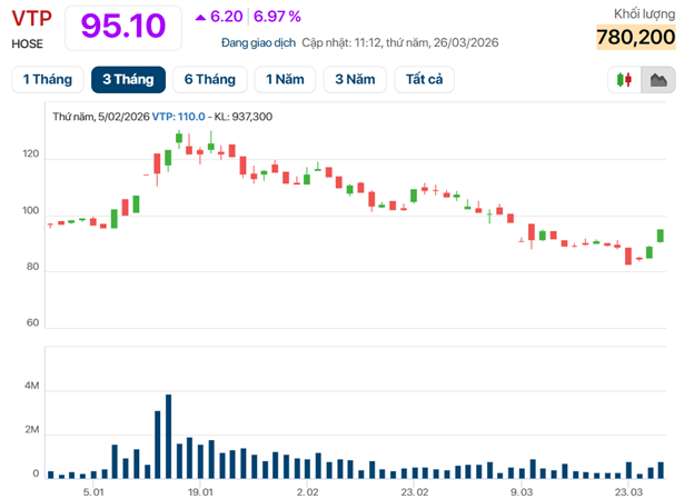 Ngay sau khi thông tin được công bố, cổ phiếu VTP lập tức tăng kịch trần lên 95.100 đồng, dư mua giá trần hơn 300.000 cổ phiếu.