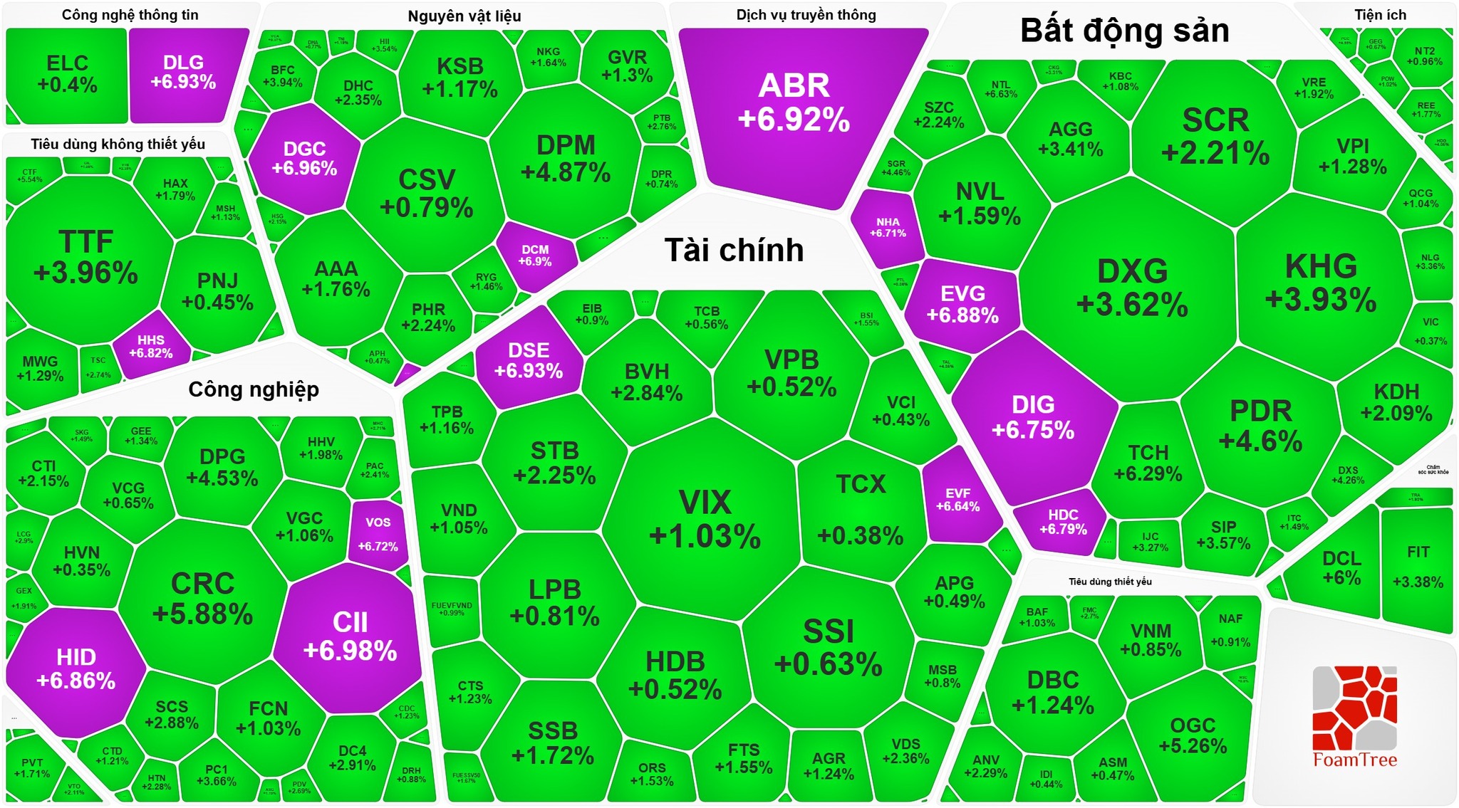 Xét theo nhóm ngành, nguyên vật liệu và bất động sản là điểm sáng của thị trường. Nhóm tài chính hôm nay dù tổng thể có một màu xanh tím khá đẹp mắt tuy nhiên vẫn có sự phân hóa nhất định.