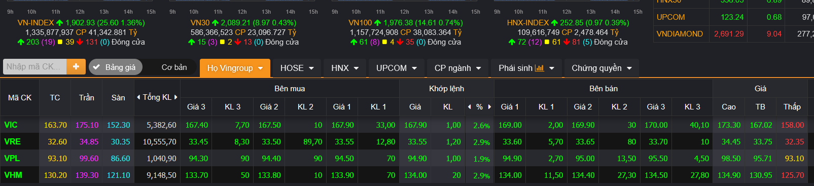 Như mình phân tích ở trên, thời điểm 14h, khi thị trường bước vào thời điểm then chốt, việc nhóm Vingroup tăng mạnh trở lại giúp chỉ số vượt mốc tâm lý quan trọng, lên trên 1.910 điểm, tức tăng hơn 33 điểm so với tham chiếu.