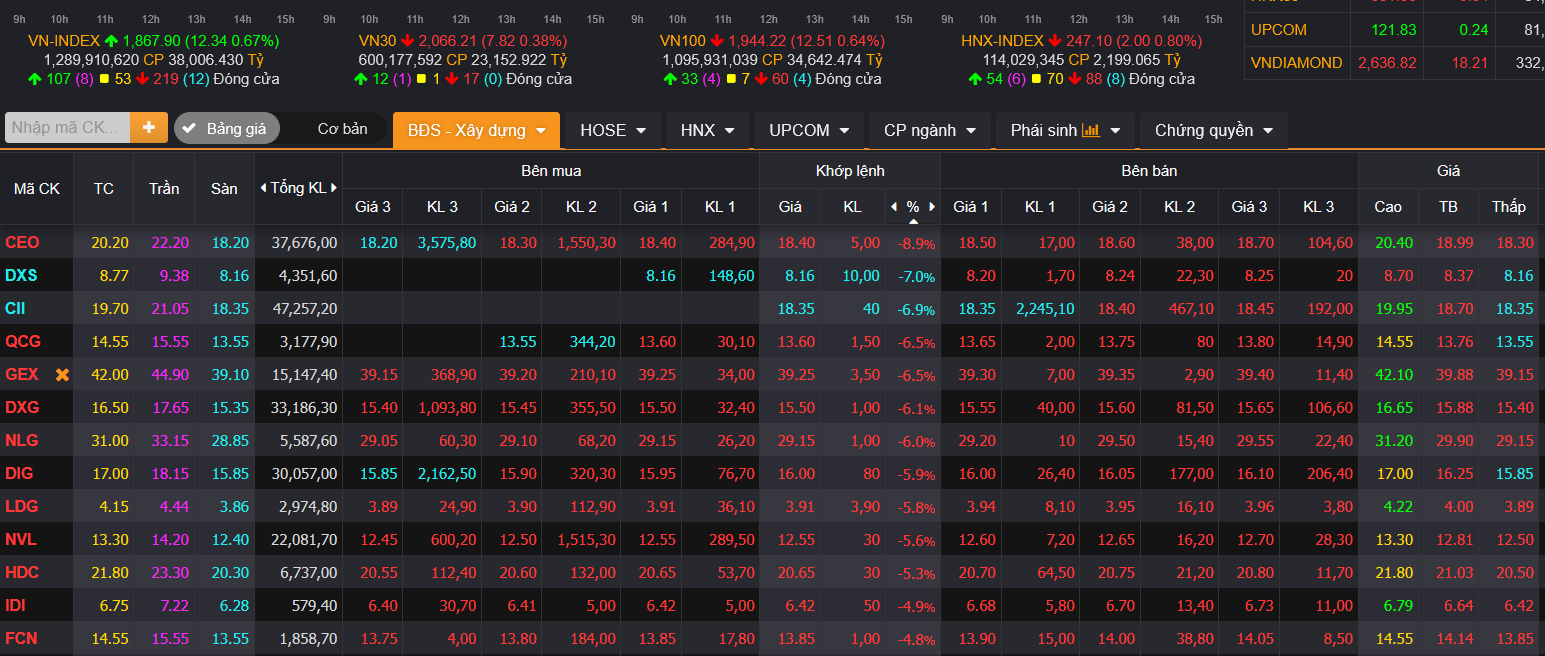 Hàng loạt mã khác như QCG, GEX, DXG, NVL, DIG, LDG, KHG, HQC… đều giảm sâu 4–6,5%.